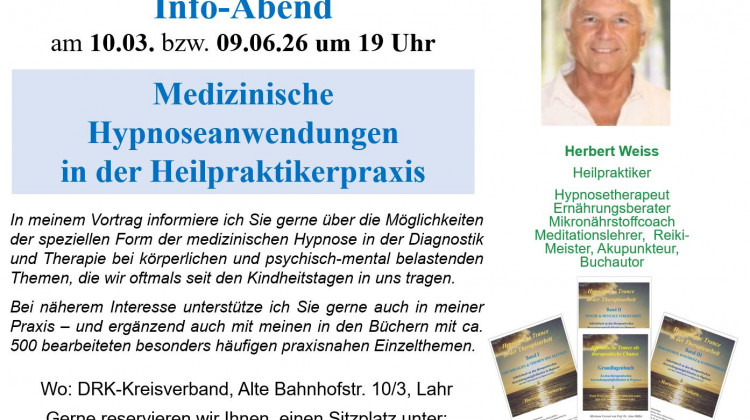 Info-Abend "Medizinische Hypnoseanwendungen in der Heilpraktikerpraxis" am 10.03.2026 in Lahr (DRK/Nestlecarreé) um 19 Uhr